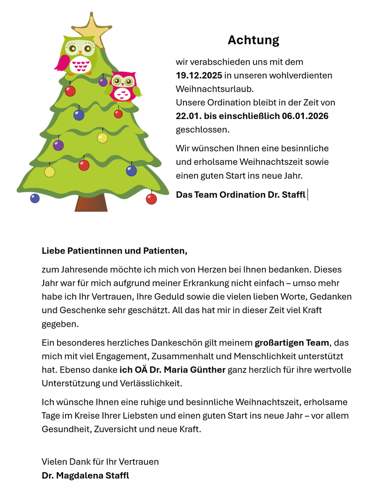 Frau OÄ Dr. Maria Günther wird mich ab Montag, 12. Mai an drei Tagen pro Woche vertreten.